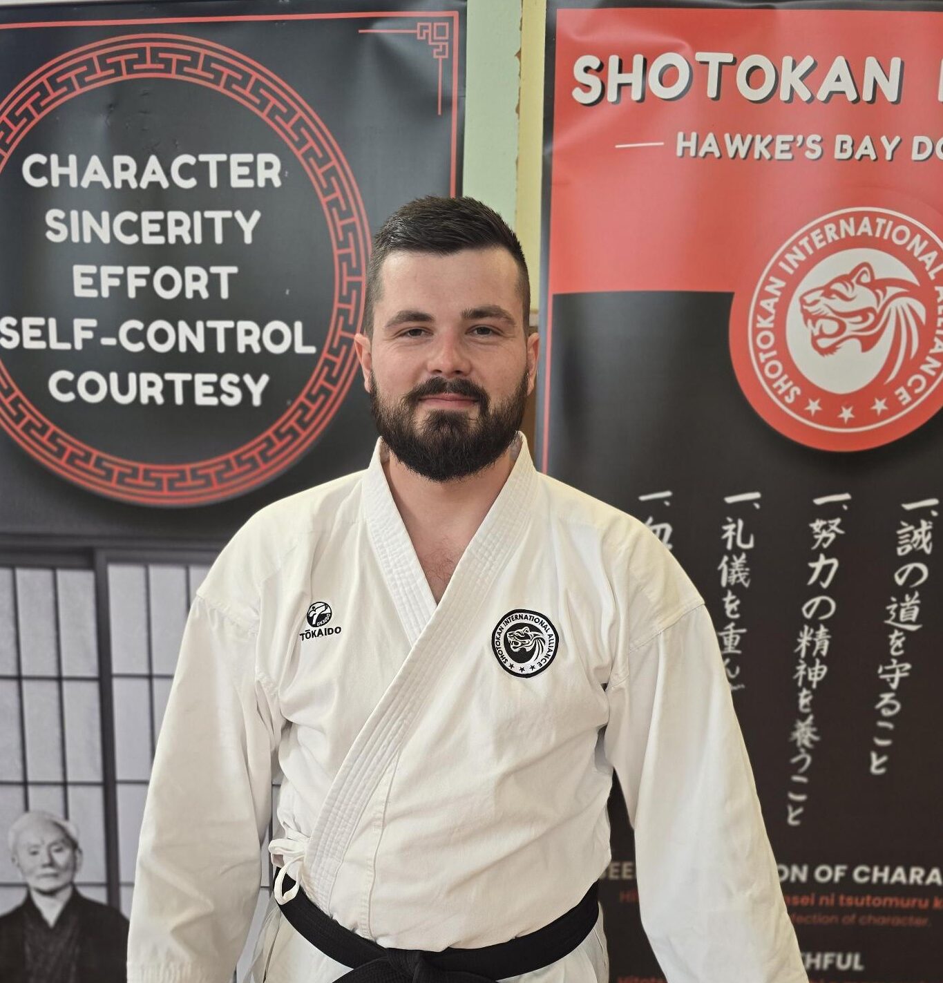 Barker sensei has trained in traditional Shotokan Karate since childhood and has trained at the Shotokan Karate Hawke’s Bay Dojo since its founding in 2008. He is a long-term student of Edmond Otis sensei, founder of the dojo, Chairman of the Shotokan International Alliance (SIA), and former Chairman and Chief Instructor of AJKA-I International, under whose guidance Barker sensei developed his technical foundation and approach to instruction. Otis sensei trained directly under Hidetaka Nishiyama sensei and Yutaka Yaguchi sensei of the Japan Karate Association, a lineage that has influenced the standards and methods maintained at the dojo.