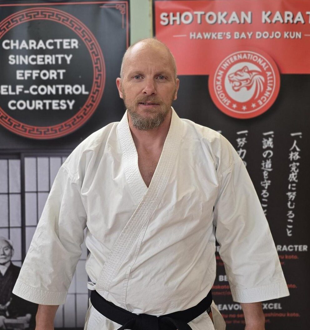 Simon was awarded his 4th Dan black belt in 2022. From 2015, he trained under Edmond Otis Sensei, further refining his understanding of traditional Shotokan Karate. He now instructs at Shotokan Karate Hawkes Bay, where his teaching emphasises technical precision, strong fundamentals, traditional values, discipline, and respect.